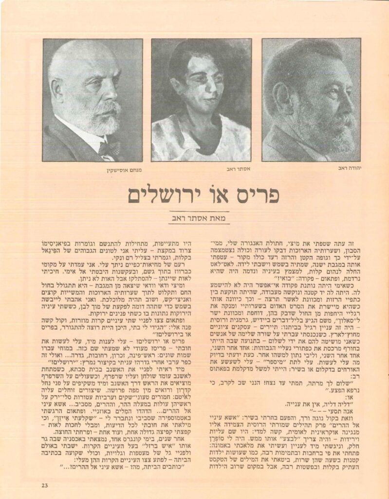 Notes: Esther Raab, “Paris o Yerushalayim?” in Kol ha-prozah (Collected Prose), ed. Ehud Ben Ezer (2001), 119–22. First published in Haaretz, April 4, 1952.