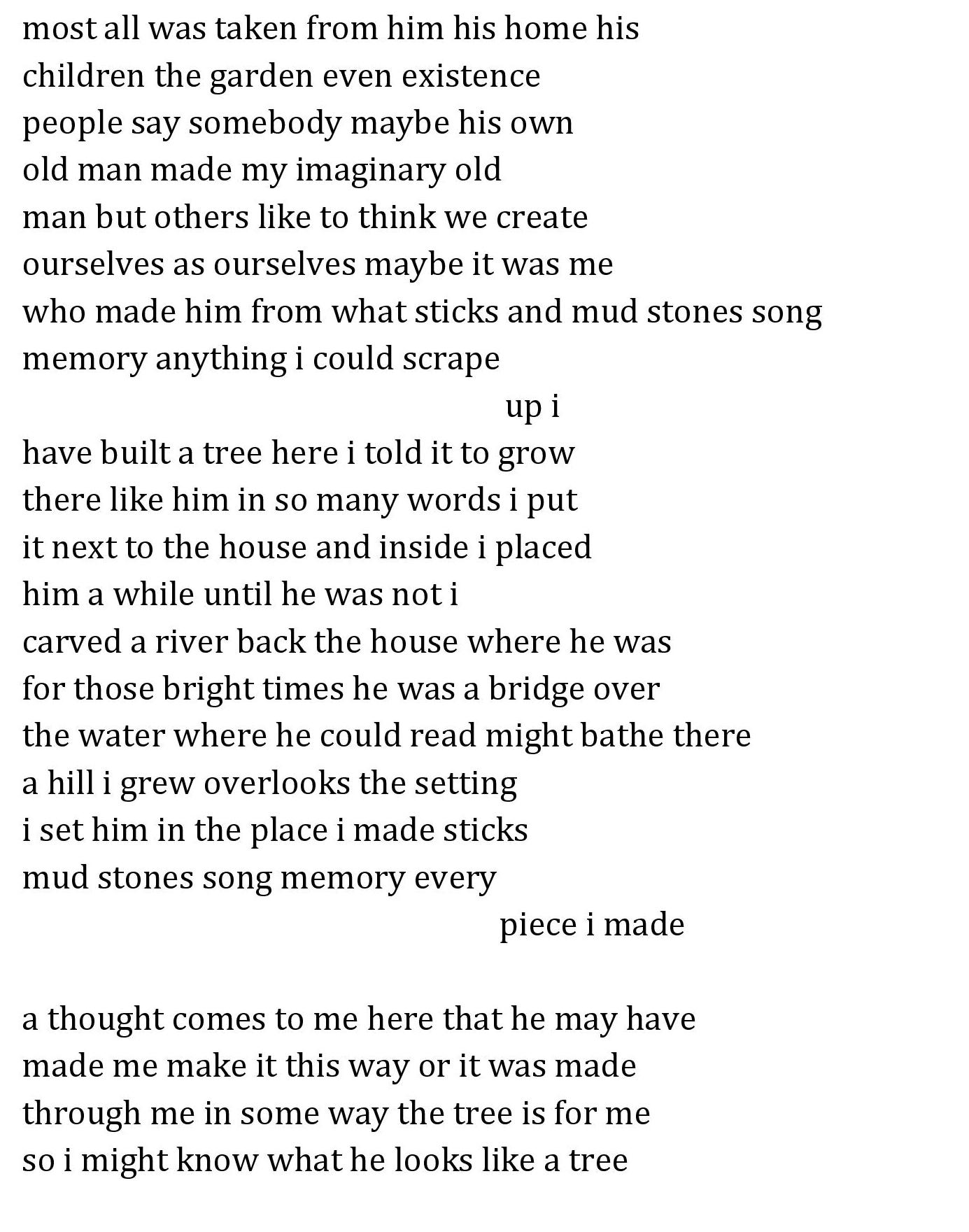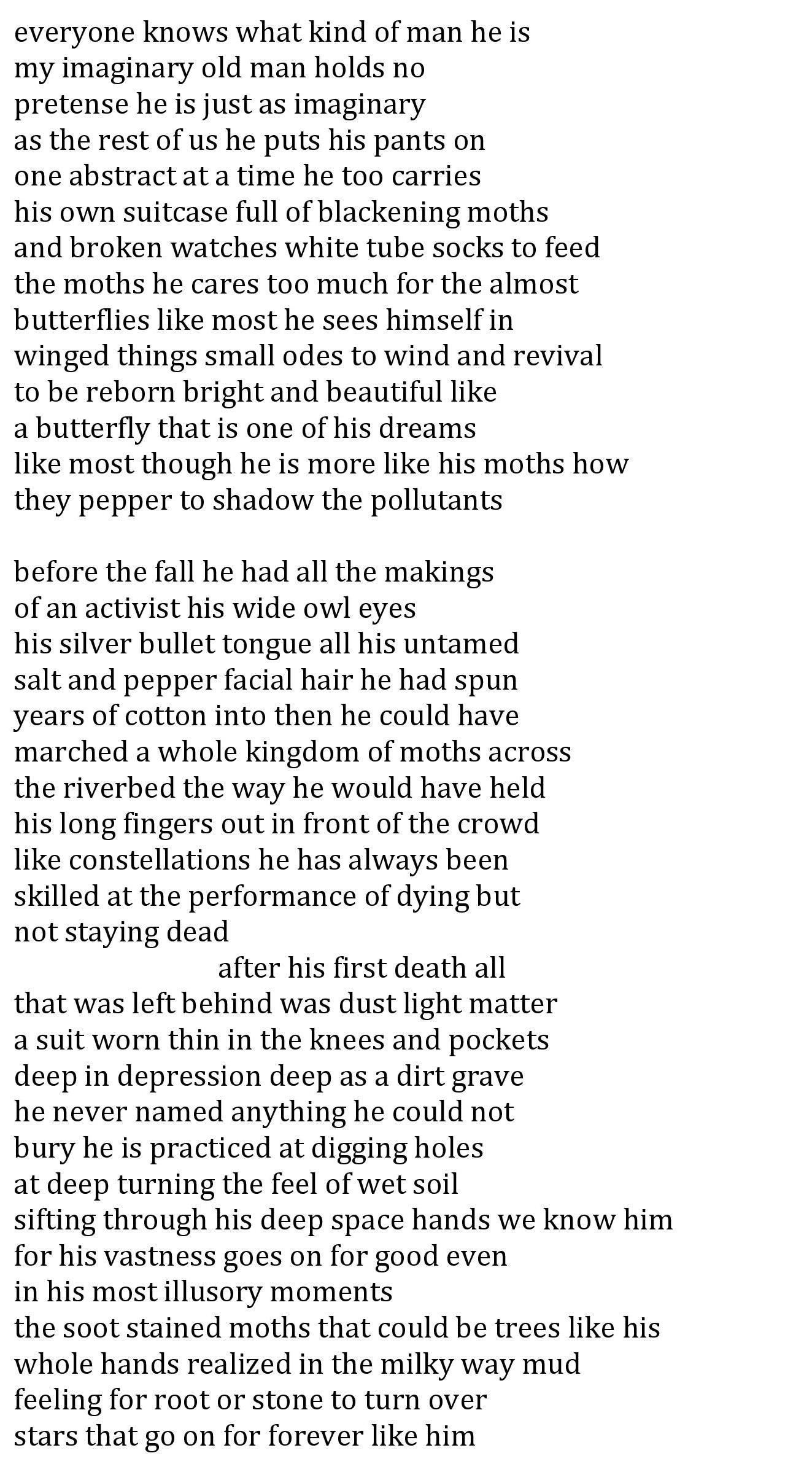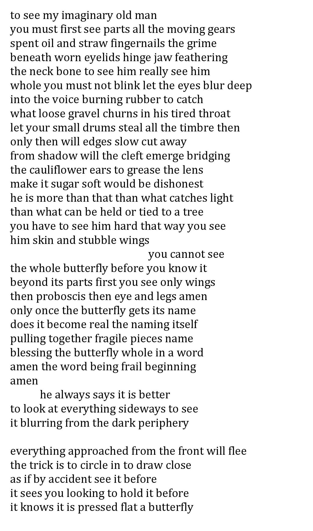 Author’s Note: These poems come from my working manuscript, my imaginary old man: poems. The project is an exercise in decasyllabics. The poems skirt the use of punctuation in order to magnify how particular lines and phrases might be read in multiple ways, creating a prismatic effect.