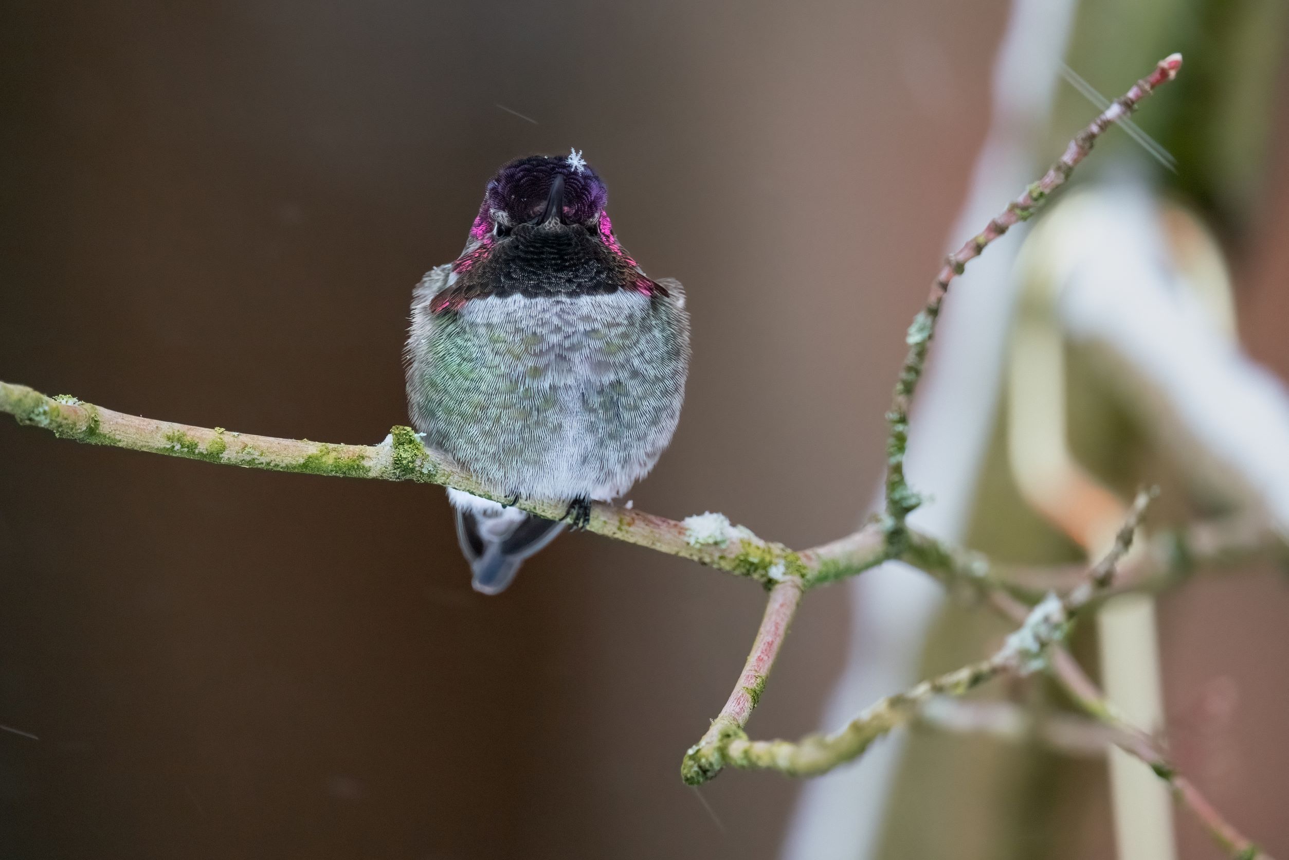 Artist’s Statement: During a deep freeze and snowstorm in Seattle, WA this winter, our resident Anna’s Hummingbirds needed some extra help to stay healthy. I had 2 feeders with Christmas lights attached to keep them from freezing, plus 2 other feeders that I brought inside at night and put back out in the morning to keep them unfrozen. This male hangs out at one of my feeders, and was out looking beautiful during the snowfall.