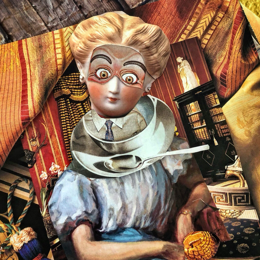 Artist’s Statement: The act of collaging for me can sometimes border on the impulsive.  I will often begin flipping through sourced magazines until something piques my interest, in this case a doll head, and off I go with a pair of scissors, slicing the image from the page.  Sitting on my comfy orange sofa I delve through the stacks of collected materials to find something interesting to add weaving and pasting the many images together, and in this case it was kind of thrown together.  My husband John is great at titles and Miss Manners Tries the Mushrooms was added when I was finished.
