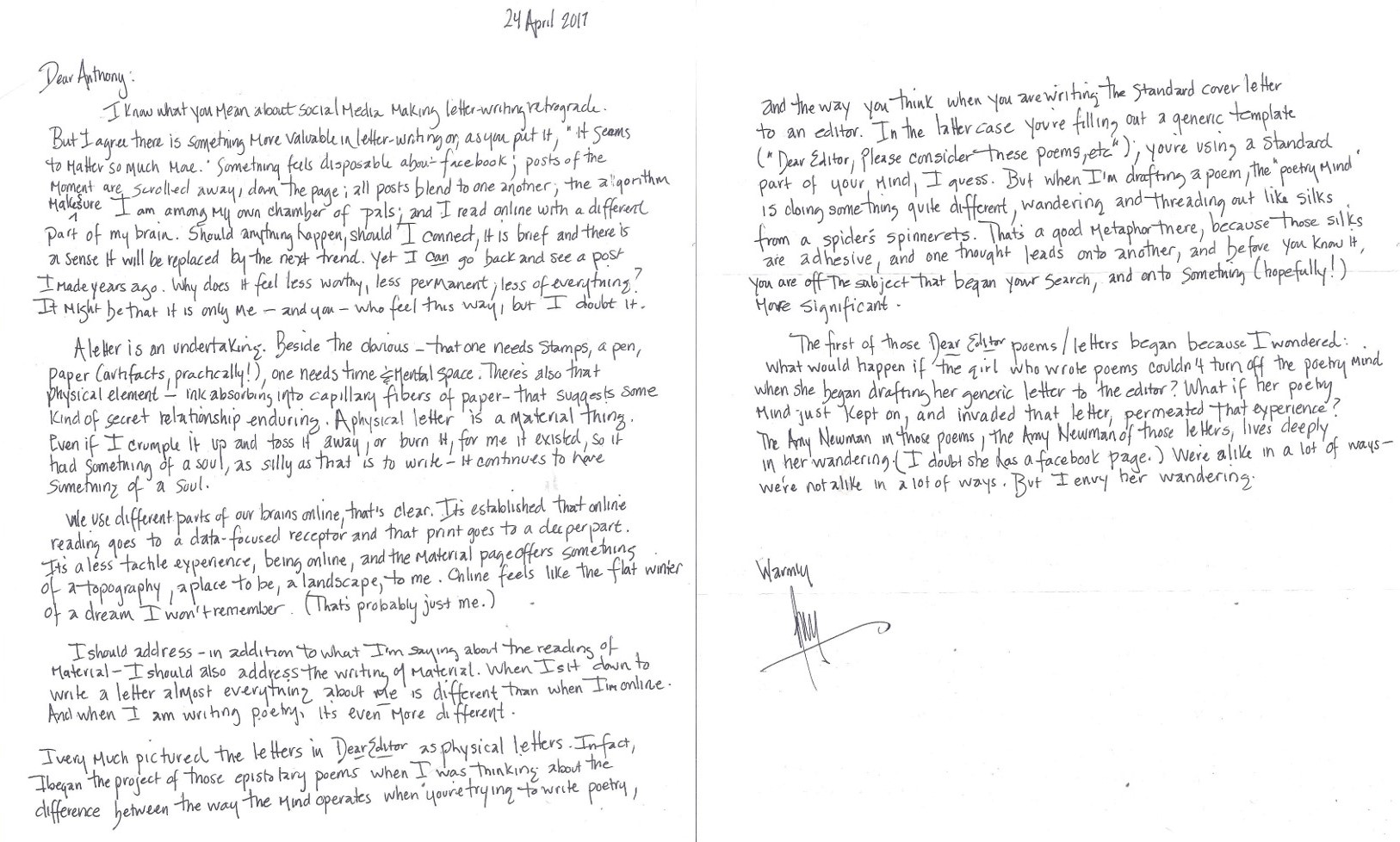 The first of those Dear Editor poems/letters began because I wondered what would happen if the girl who wrote poems couldn’t turn off the poetry mind when she began drafting her generic letter to the editor? What if her poetry mind just kept on, and invaded that letter, permeated that experience? The Amy Newman in those poems, the Amy Newman of those letters, lives deeply in her wandering. (I doubt she has a facebook page.) We’re alike in a lot of ways – we’re not alike in a lot of ways. But I envy her wandering.