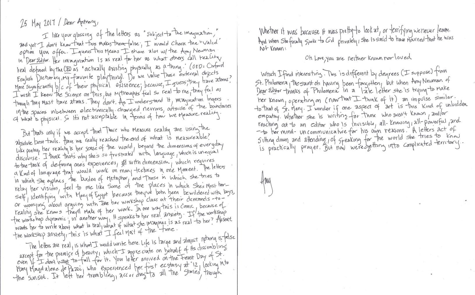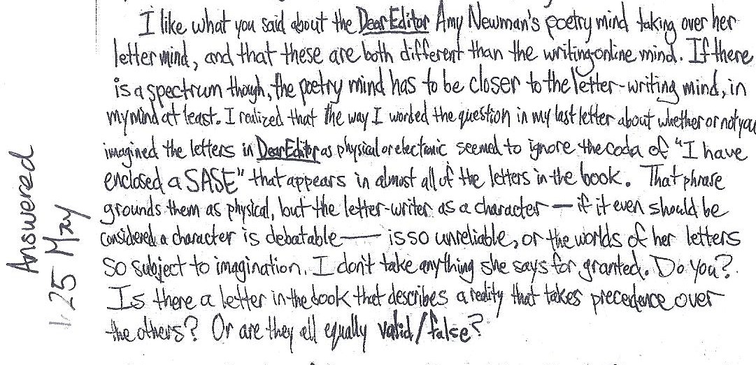 I like your glossing of the letters as “subject to imagination,” and yet I don’t know that this makes them false; I would choose the “valid” option you offer. I guess this means I share a lot with the Amy Newman in Dear Editor. Her imagination is as real for her as what others call reality, real being defined in the OED as “actually existing physically as a thing.” (OED = Oxford English Dictionary, my favorite plaything). Do we value those external objects more significantly because of their physical existence; because, I guess, they have atoms? I wish I knew the science on this, but my thoughts are so real to me, they feel as though they must have atoms. They don’t. As I understand it, imagination lingers in the spaces in between electronically-charged neurons, outside of the boundaries of what is physical. So it’s not acceptable in terms of how we measure reality.